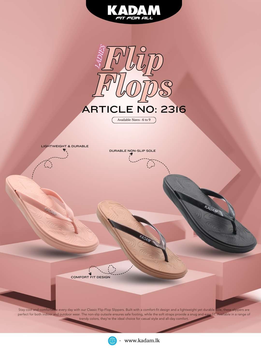 The KADAM Article No: 2316 slippers are available in sizes 6 to 9, offering a secure fit for many users. Their durable structure ensures long life, while the feather-light feel provides all-day comfort. As a result, these slippers are the perfect balance of style, practicality, and value.